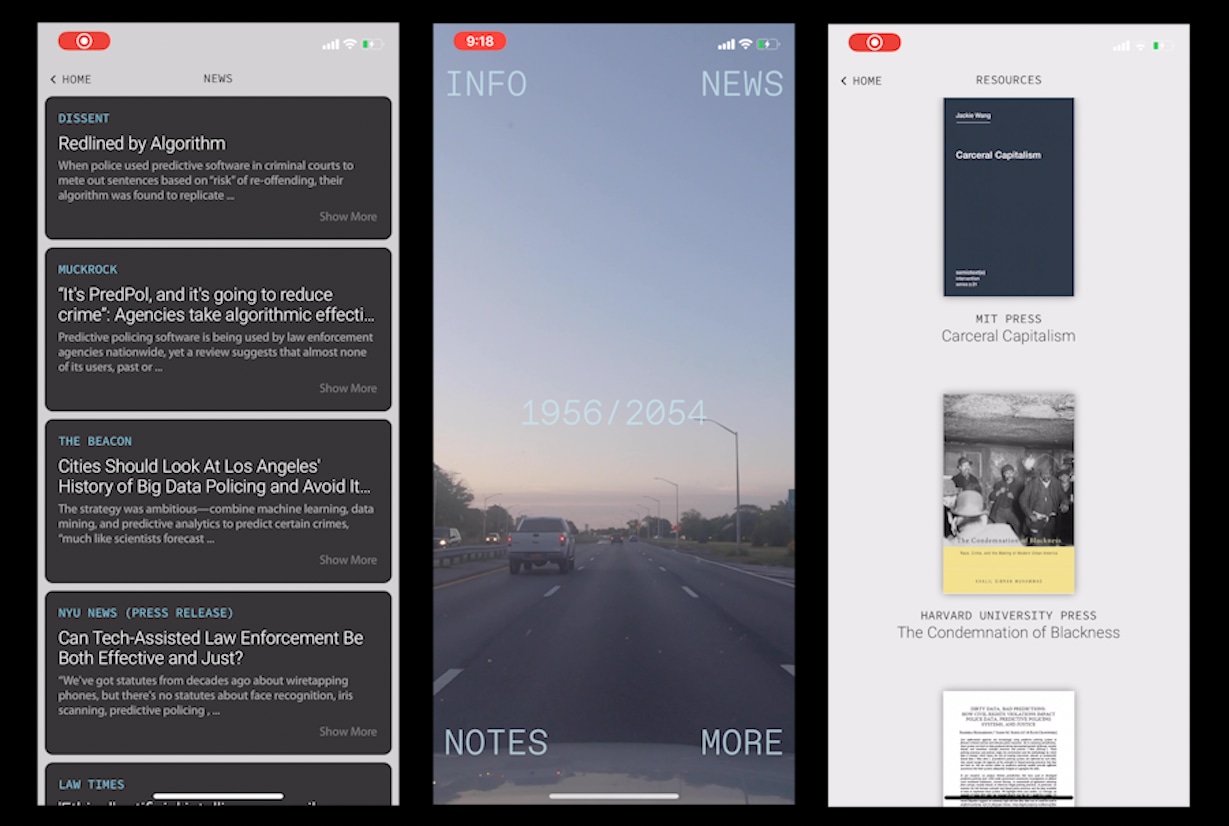 1956/2054 is a mobile application that complements American Artist's exhibition called "My Blue Window" at Queens Museum focused on predictive policing.